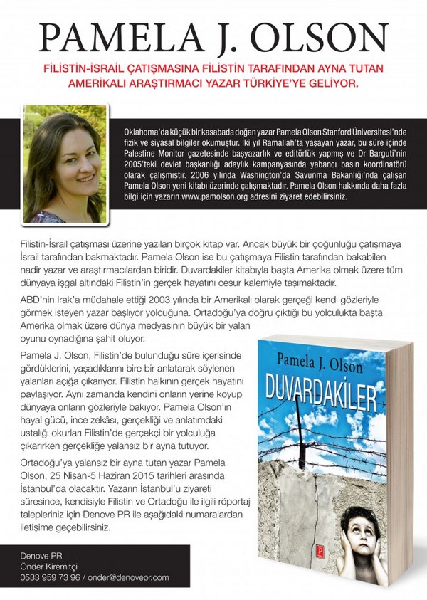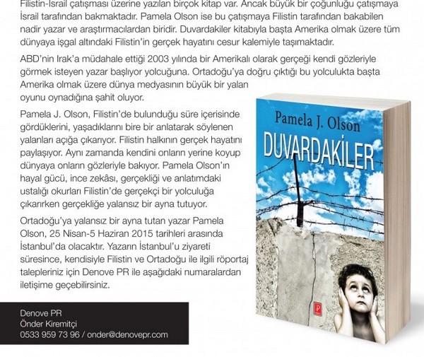 Filistin Ramallah’ta iki yıl boyunca yaşayan Pamela Olson, anılarında kendini duvarın ardında yaşayan insanların yerine koyup dünyaya onların gözünden bakıyor. Onların hayatlarını, aşklarını, acılarını, bayramlarını, misafirperverliklerini ve umutlarını paylaştığı kitabı “Duvardakiler” okuyucusunu Filistin’de gerçek bir yolculuğa davet ederken aynı zamanda İsrail işgalinin gerçek yüzünü ortaya koyuyor.