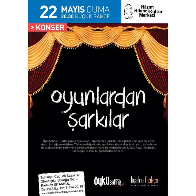 Tiyatro Açıkça, 22 Mayıs Cuma akşamı “Oyunlardan Şarkılar” ile çok güzel bir konsere imza atacak! Aybars Yılmaz ve değerli müzisyenlerle yoğun bir çalışma dönemi geçiren ekip; ünü tiyatro sahnelerini de aşan şarkıları, gerek koro gerek solo performans ile seslendirecek. Lüküs Hayat, Nagasaki, Bir Zengin Olsam, bu şarkılardan sadece bir kaçı…
