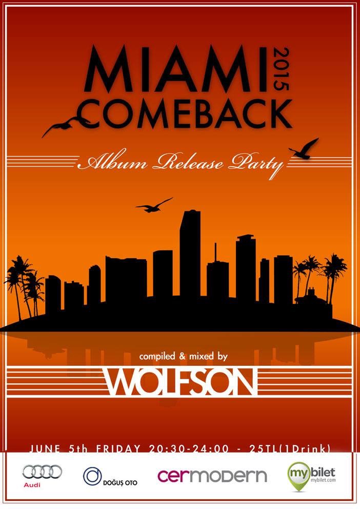WOLFSON’in geleneksellesen albumu, “MIAMI COMEBACK 2015”, 5 Haziran 2015 cuma gecesi cikiyor !Bu geceyi 6. yilinda, WOLFSON’in uc saatlik performansi ile @CerModern ’de bir yaz aksaminda, #AUDI #DogusOto ve #RedBullTR’in katkilariyla hep beraber kutlayalim.
