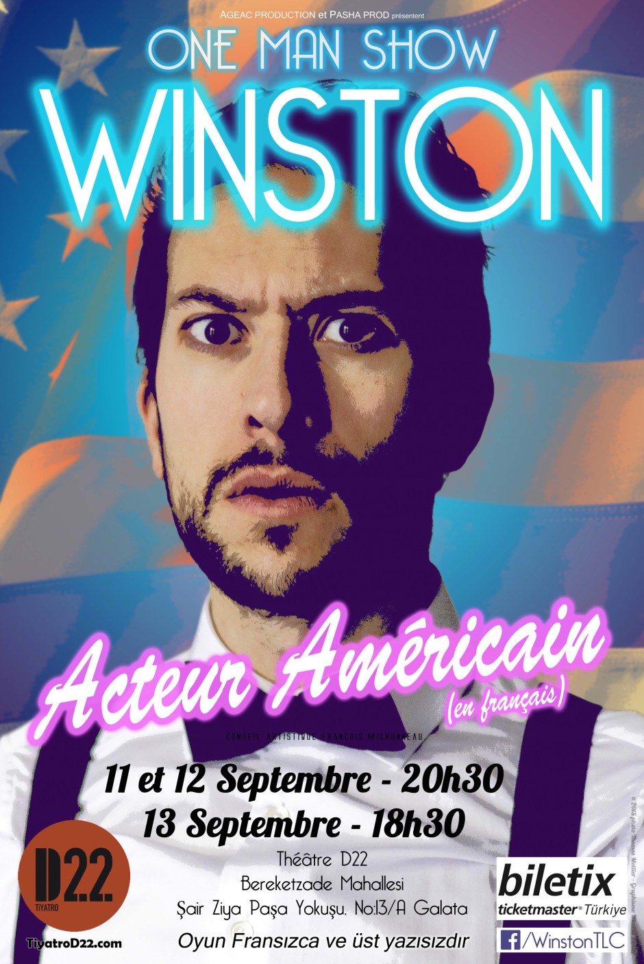 Winston Thomas Lawrence Carter, tek kişilik oyunu Winston: Acteur Americain, “Amerikalı Oyuncu Winston” ile İstanbul prömiyerini 11 – 12 – 13 Eylül’de Tiyatro D22’de yapıyor.