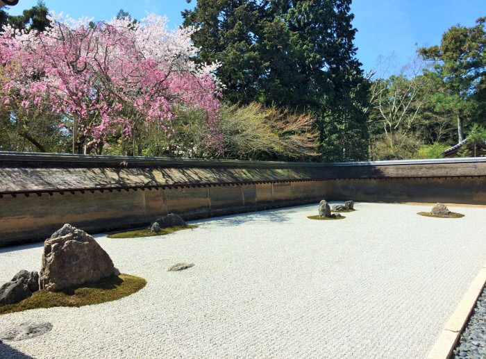 Ryoanji ya da ‘Huzur Uykusundaki Ejderha’ tapınağı nefis bir Zen tapınak mimarisi, bahçe peyzajı ve Zen bahçesi tasarımı örneği. Zen bahçesindeki kaya ve taşların sembolik yerleşimi, izleyenleri sakinliğe, huzura ve farkındalılığa taşıyan etkiye sahip.