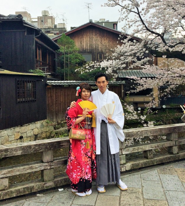 Gion bölgesinde iken geyşa ve samuray kıyafetlerine bürünmüş gelin damatlara rastlıyorsunuz. Bizde plajlarda, tarihi semtlerde bina önlerinde gelinlik ile fotoğraf çektirmek makbul ya, orada da Gion meşhur bir fotğraf seti görevi görüyormuş.