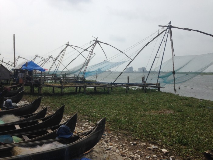 Öğle yemeğinden sonra Fort Kochi’nin 12. yüzyıldan bu yana baharat ticaretinin en önemli noktalarından olan limanı da görebildiğimiz ‘Chinese fishing nets’ (Çinliler geliştirdiği için bu şekilde anılan bir balık ağı çeşidi) civarında turluyoruz. Burası balıkçıların, satıcıların ve turistlerin mekanı. Gün batımlarında nefis karelere imkan tanıyan ağlar bulutlu bir güne denk geldiğim için çok ta fotografik değiller.