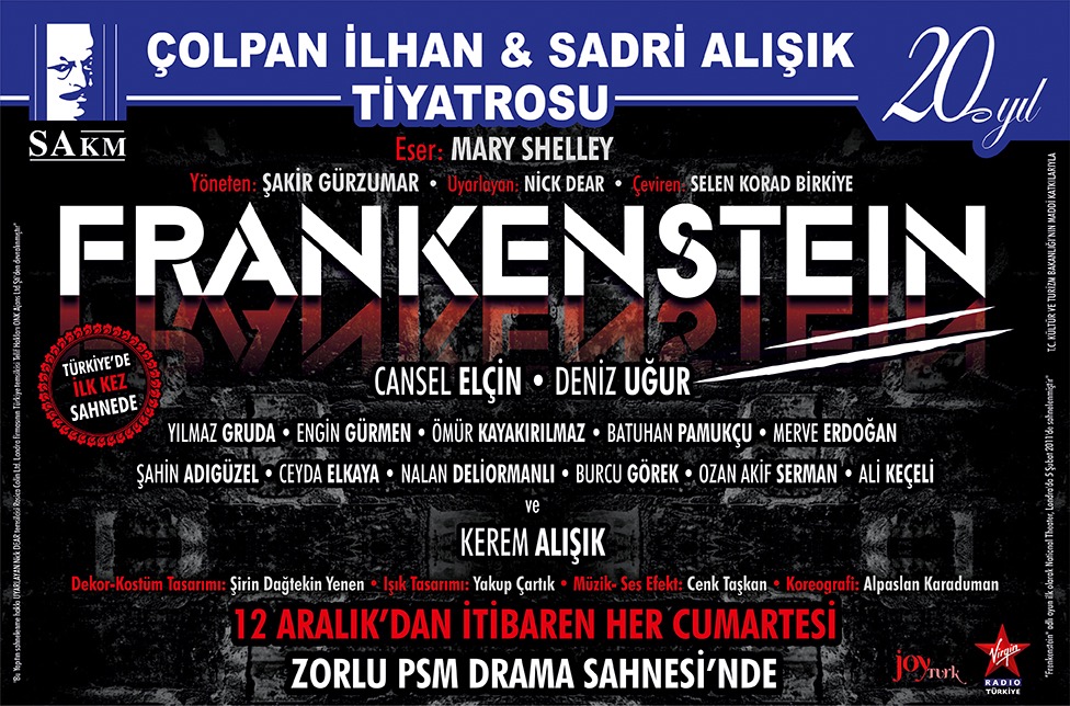 Mary Shelley’in romanından Nick Dear tarafından uyarlanan Selen Korad Birkiye’nin çevirisini yaptığı FRANKENSTEIN Şakir Gürzumar yönetimininde Türkiye’de ilk kez Virgin radyo sponsorluğunda sahneleniyor.