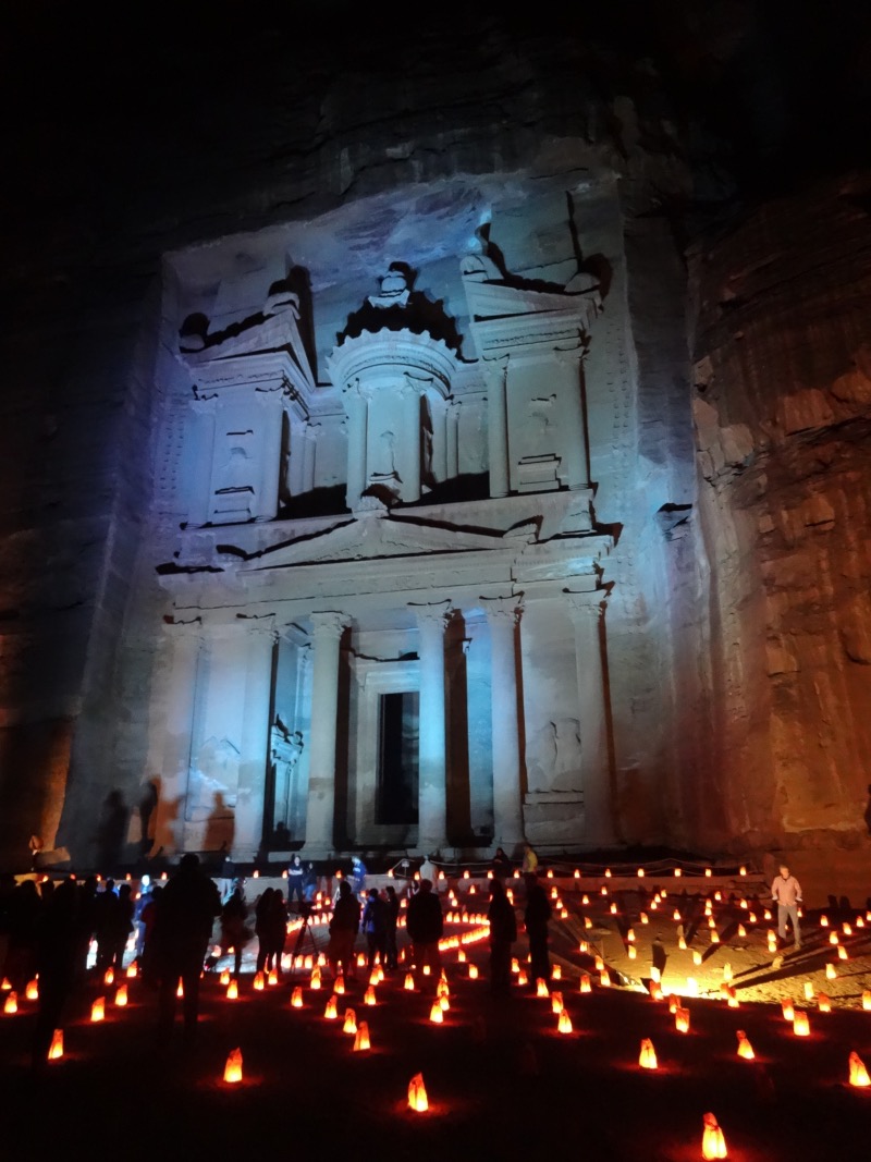 Yüzlerce mumla aydınlatılan ve 1,5 kilometre uzunluğundaki Petra’nın girişine ulaştıran ‘Sig’ yolunda, gecenin karanlığında dev yeryüzü şekilleri arasında ilerlerken şehrin kurucusu olan Nebatilerden Romalılara kadar geçmişte burada yaşamış uygarlıkların yaşamlarını zihnimde canlandırmaya çalışıyorum. Gecenin karanlığında Petra’nın girişindeki meşhur El-Hazne karşıma çıktığında büyüleyici atmosferin etkisi katlanıyor. Yere serilmiş halılarda sessiz bir şekilde yerlerini alan biz turistler nefeslerimizi tutarak ve bir yandan bu anı ölümsüzleştirmeye çalışarak, El Hazne’nin derinliklerinden gelen flüt sesini dinliyoruz.