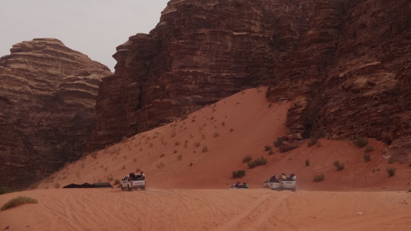 Wadi Rum’a vardığımızda otobüsten inip, kamyonetlerin arkasına bindiğimizde, Mars’a getirilmiş bir koloni olarak hissederek ilerliyoruz. Bir süreyol aldıktan sonra belli bir noktada iniyor ve kum tepelerine çıplak ayak tırmanıyoruz. Ayaklara yapışmayan kıvamdaki kumun yarattığı his yine başka gezegende olduğum hissi.
