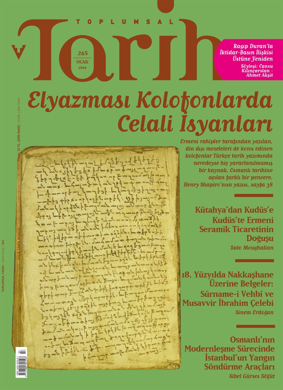 Toplumsal Tarih Ocak 2016 sayısında Henry Shapiro’nun “17. Yüzyıl Osmanlı-Ermeni Sosyal ve Entelektüel Tarihine Aralanan Yeni Bir Pencere: Ermenice Elyazması Kolofonlar” başlıklı yazısını kapağa taşıdı. Henry Sapiro, Ermeni rahiplerin yazdığı ve Türkçe tarih yazımında neredeyse hiç yararlanılmamış olan elyazması kolofonlardan örnekler sunuyor.