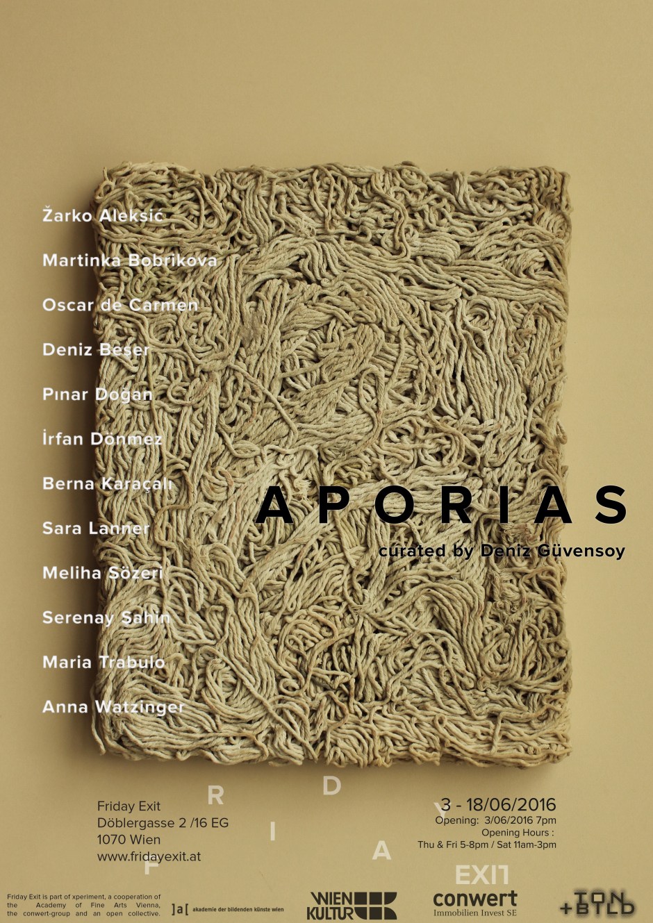 Sırbistan, Avusturya, Portekiz, Slovakya, İspanya ve Türkiye’den on iki sanatçının Apori kavramını kendi sanatsal pratikleri içinde ifade etmenin yollarını araştırdığı ‘Aporias/Aporiler’ isimli sergi Viyana Güzel Sanatlar Akademisi’ne bağlı bir kolektif tarafından yönetilen Friday Exit sanat galerisinde 3 Haziran – 18 Haziran 2016 tarihleri arasında gerçekleşiyor.