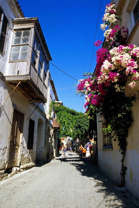 Alaçatı’nın püfür püfür esen rüzgarı eşliğinde, şose parkeli daracık sokaklarda yürüken, bir şiirin mısraları gibi yanyaya dizilmiş birbirinden güzel taş evlere hayran kalmamak mümkün değil. Akşamüstü renklerin tüm canlılığı ile ortaya çıktığı saatlerde, taş duvarlardan yükselen pembe begonviller, cam önlerinden akan turuncu ve kırmızı sardunya ve mor nergisler, yol kenarında coşmuş lavanatalar, mavi ve beyaz yaseminler ile hayranlık uyandırıcı bu taş ustalığının, hepsi birbirinden güzel kapı, pencere ve cumbaların tadına varmak için en uygun zaman.