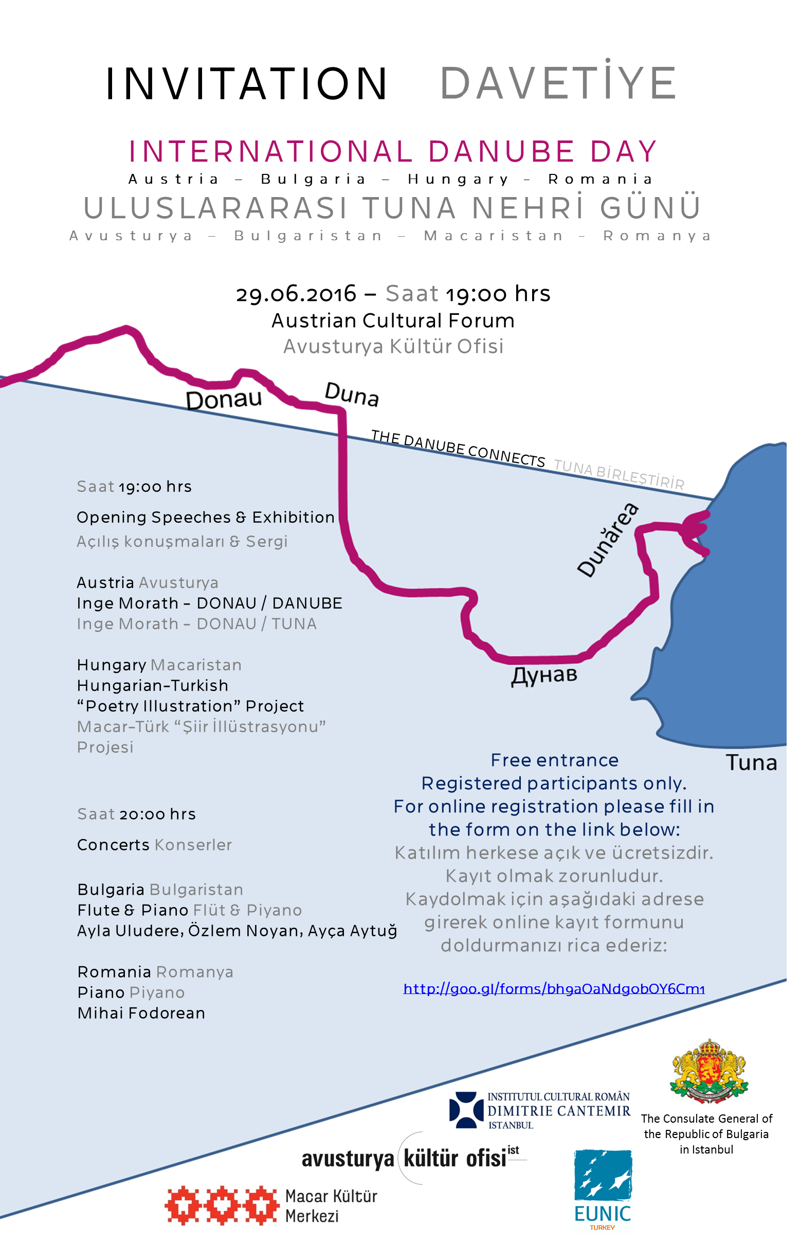 Uluslararası Tuna Nehri Günü dolayısıyla Tuna nehrinin dört komşusu Avusturya, Bulgaristan, Macaristan ve Romanya’nın katılımlarıyla düzenlenen ortak etkinliklerimizde hepinizi görmekten mutluluk duyarız.