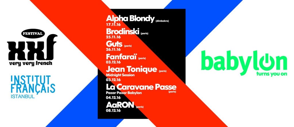 İstanbul Fransız Kültür Merkezi ve Babylon işbirliğiyle düzenlenen festivalde, bu sene 17 Kasım – 8 Aralık tarihleri arası Alpha Blondy, Aaron, Brodinski, Fanfaraï, Guts, Jean Tonique, La Caravane Passe, Rover ve The Shoes Babylon’da sahne alıyor. Bu yıl Ankara’da 6 – 16 Aralık tarihleri arası ilki gerçekleşecek olan XXF – Very Very French müzik festivalinde ise AaRON, Club Cheval ve Nouvelle vague sahne alacaklar.