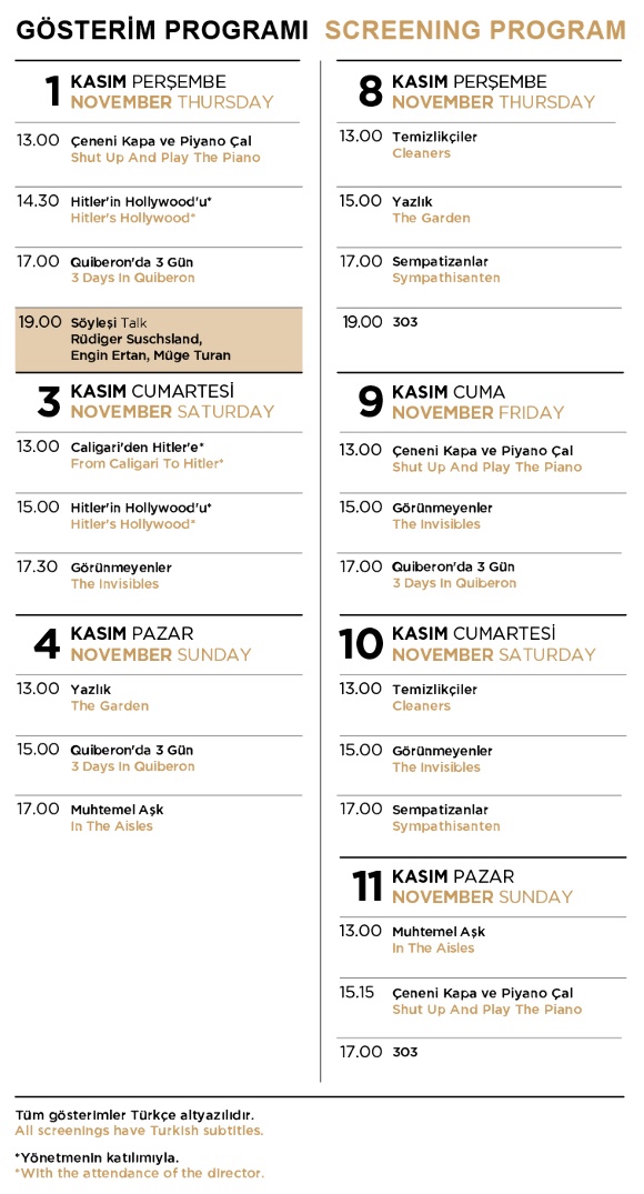 Bu yıl Berlinale’de Altın Ayı için yarışan ve Alman Film Ödülleri’nde En İyi Film, En İyi Yönetmen ve En İyi Kadın Oyuncu dahil 7 dalda zafere ulaşan Quiberon’da 3 Gün, 1 Kasım’da gösterilen filmler arasında yer alacak. Nazi döneminde Almanya’da çekilen propaganda filmlerinin bir analizi olan ve film eleştirmeni Rüdiger Suchsland’ın yönettiği Hitler’in Hollywood’u seçkide öne çıkan belgesel yapımlardan biri. Rüdiger Suchsland 1 ve 3 Kasım günleri filmlerinin gösterimlerine de katılacak ve seyircilerin sorularını cevaplayacak.
