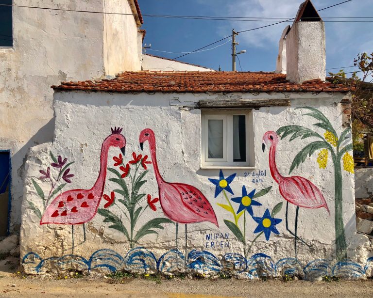 Başka bir soluklanma, çay kahve içme durağı ise köye duvar resimlerini kazandırarak ünlendiren Nurdan Erden’in evi. Yemeyşil çiçekler içinde bir ev ve asmalar altındaki avlunun girişinde ‘Goca Emine – Nurdan Erden’in Evi’ tabelasını göreceksiniz.