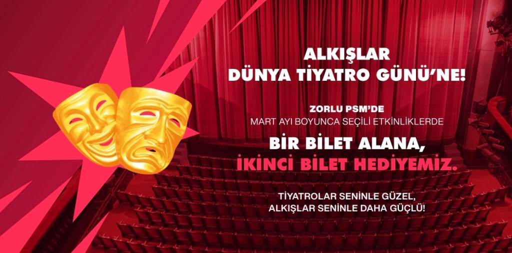 Zorlu PSM, sahne tozunu seven herkesi tek bir bilette buluşturuyor ve 27 Mart Dünya Tiyatro Günü’nde en sevilen performansları sevdiklerinizle izleyebilmeniz için bir bilet alana bir bilet bedava kampanyası başlatıyor!