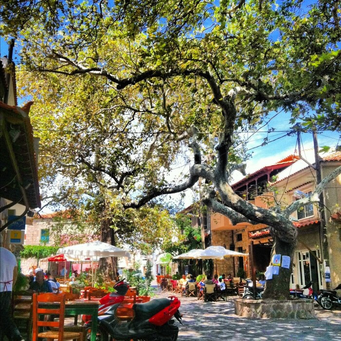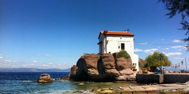 Denizin önünden geçen daracık yollar, deniz üzerinde meze ve uzo servis eden mini tavernalar, yine denizin dibinde iki katlı ferforje balkonlu oteller… Akşamüstü deniz keyfinden sonra balkon demirlerine asılmış havlular ve mayolar, balkonlarda gün batımına nazır kağıt oynayan aileler, yol kenarlarında ya da meydanlarda toplanmış sohbete dalmış gençler, oyun oynayan çocuklar… Denizle içiçe ancak köy ve kasaba yerlilerinin rutinleri ile gerçekten yaşayan bir ada.