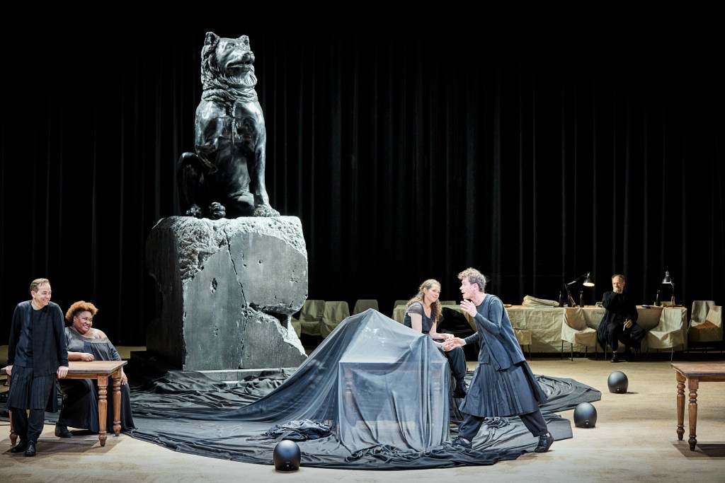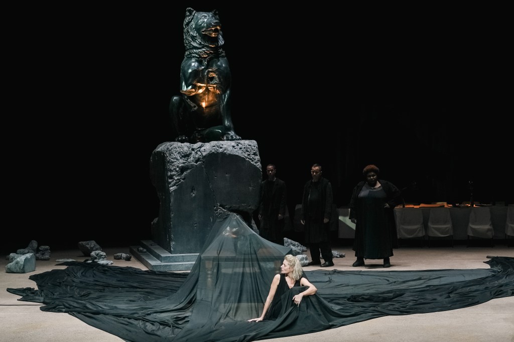 Gösteride antik ve çağdaş, evrensel görünen basit siyah kostümler iç içe geçmiştir. Oyun içinde oyun şeklinde ilerleyen konu, oyun provası yapan bir grup tiyatrocuyla, hayatın gerçek sorunlarıyla mücadele eden bir annenin savaşını aynı kare içinde birleştiriyor. Senaryo aslında basittir, bir masa ve sandalyeler – ancak oyunun ikinci yarısında ortaya çıkan dev bir köpek heykeli de vardır. Bu, Hekabe mitine bir göndermedir; bu mite göre, intikamı için onu cezalandırmak isteyenlerden kaçabilmek için tanrılar tarafından bir köpeğe dönüştürülmüştür. Bu gösteride, anne-çocuk ilişkisi aracılığıyla antik ve çağdaş dünyaları birbirine bağlıyoruz. Gösterinin sonunda Nadia, çocuğu için hüzünle bağırırken, hayvanla insan arasında kurulan en basit duygusal bağın anlamı konuya hakim oluyor.