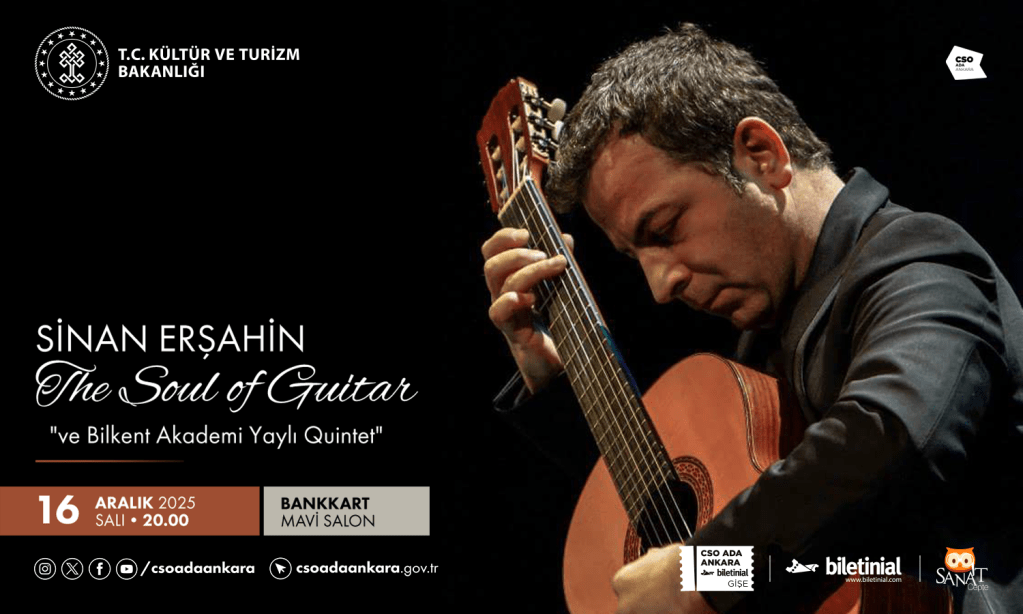 Klasik gitarın eşsiz tınılarını ön plana çıkaran Sinan Erşahin, “The Soul Of Guitar” projesiyle 16 Aralık 2025 Pazartesi günü saat 20.00’de CSO Ada Ankara Bankkart Mavi Salon sahnesinde müzikseverlerle buluşacak.